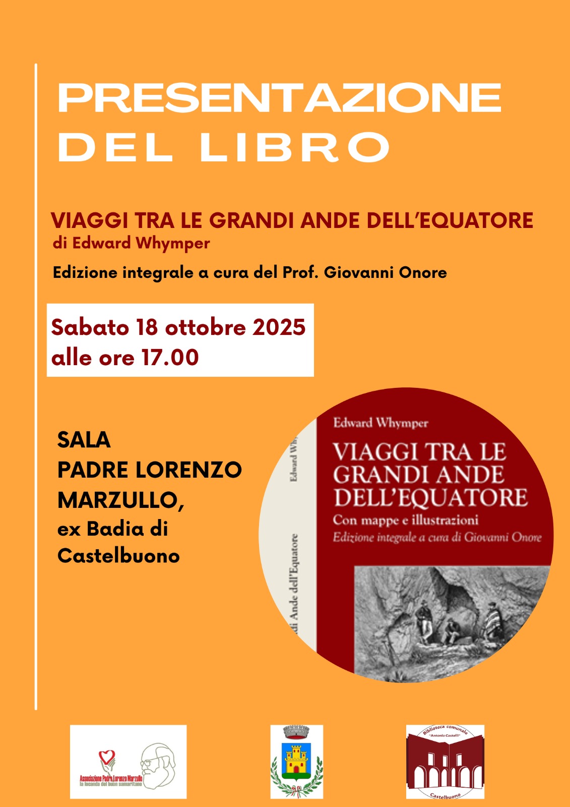 L’Associazione Padre Lorenzo Marzullo è lieta di invitarvi sabato 18 ottobre 2025, alle ore 17:00, nella Sala Padre Lorenzo Marzullo, Monastero Santa Venera (Badia), alla presentazione del libro dell’autore Edward Whymper “VIAGGI TRA LE GRANDI ANDE DELL’EQUATORE”.